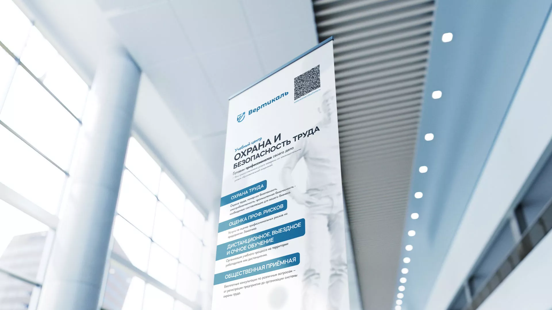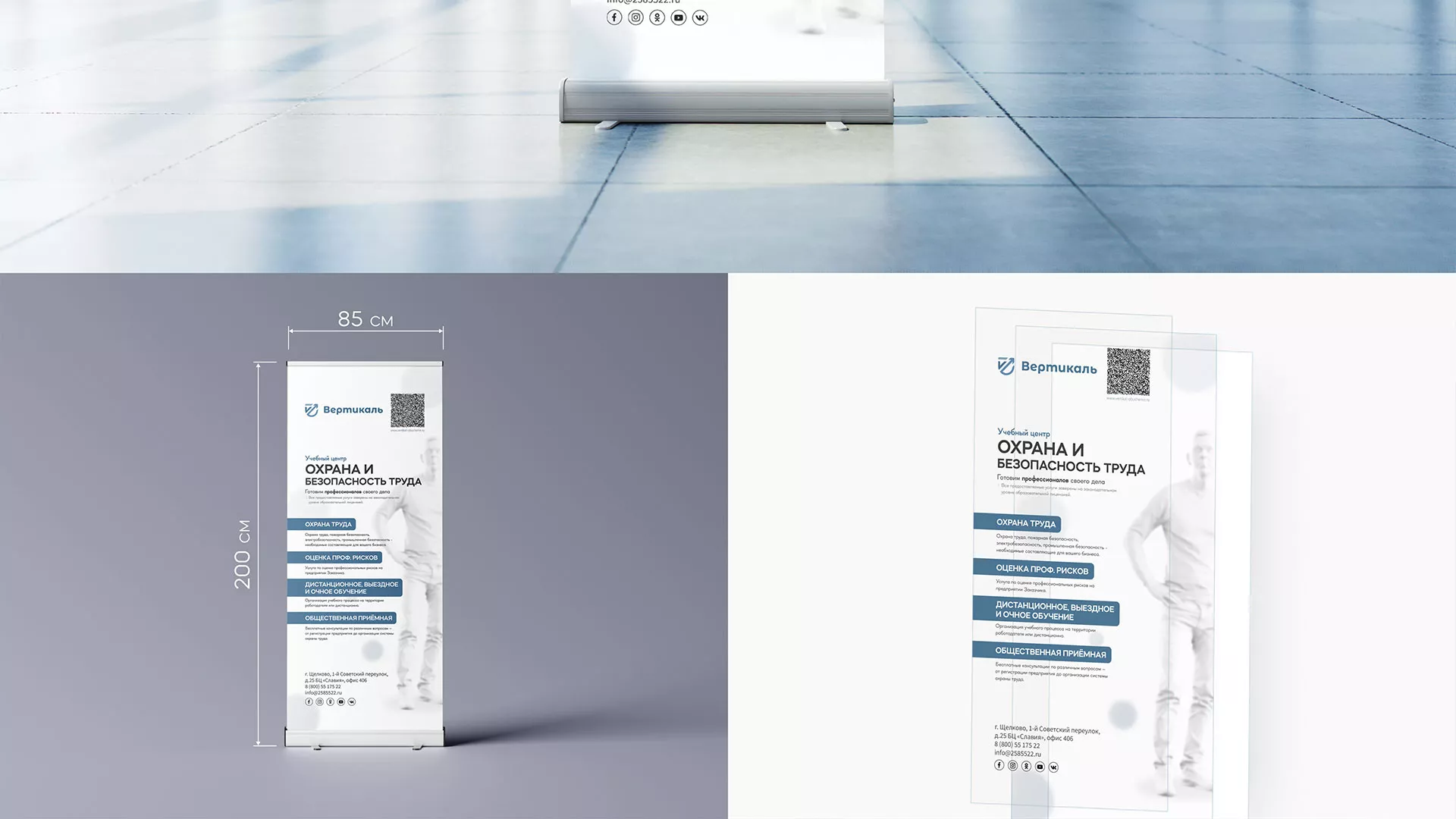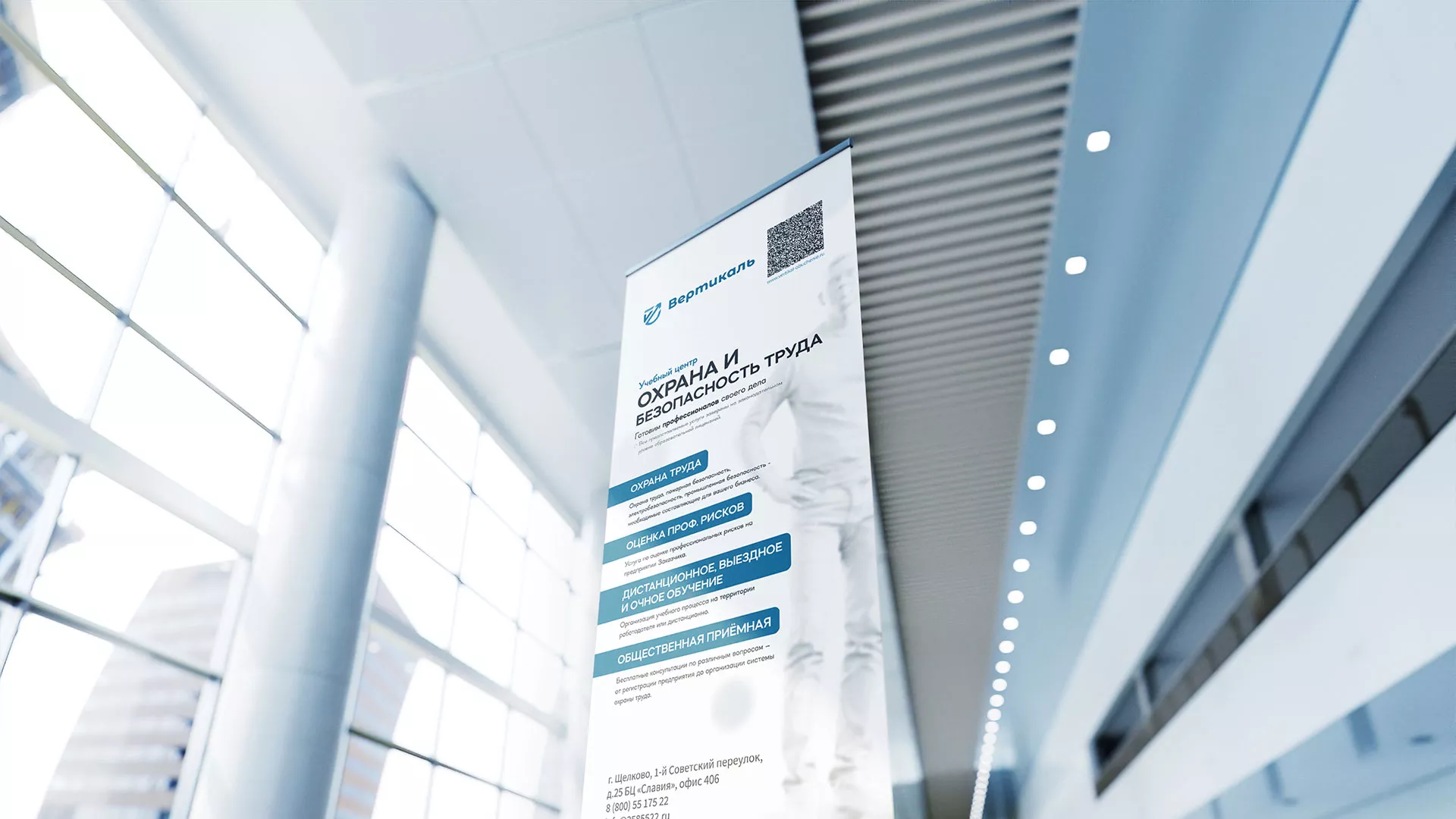 После разработки фирменного стиля и создания сайта, мы приступили к разработке дизайн-макета ролл-ап стенда в Окуловке для учебного центра «Вертикаль».