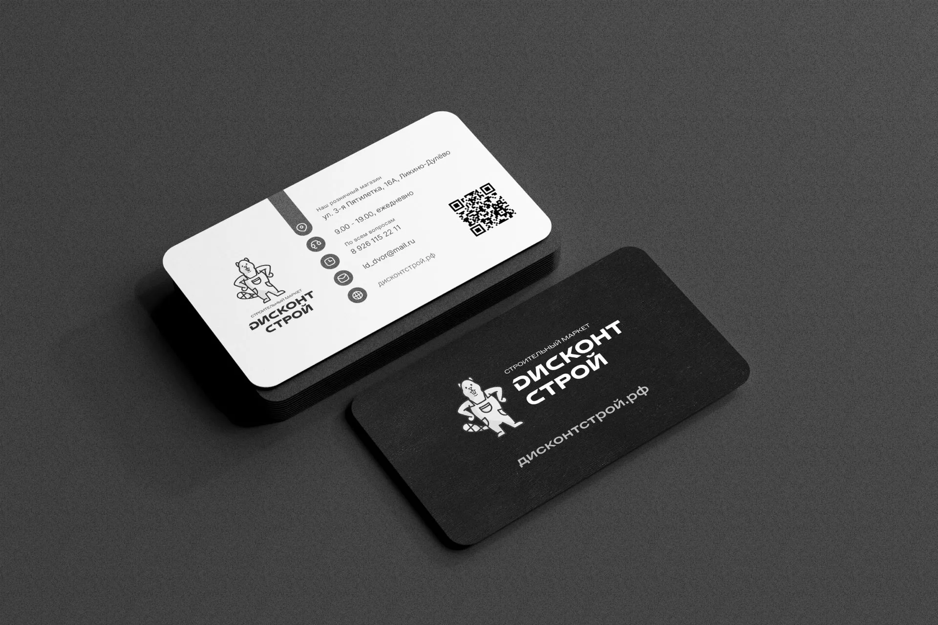 Вместе с логотипом, мы предложили заказчику сразу визуализацию логотипа в возможном дизайне на фирменный визитках магазина «Дисконт Строй» в Окуловке.